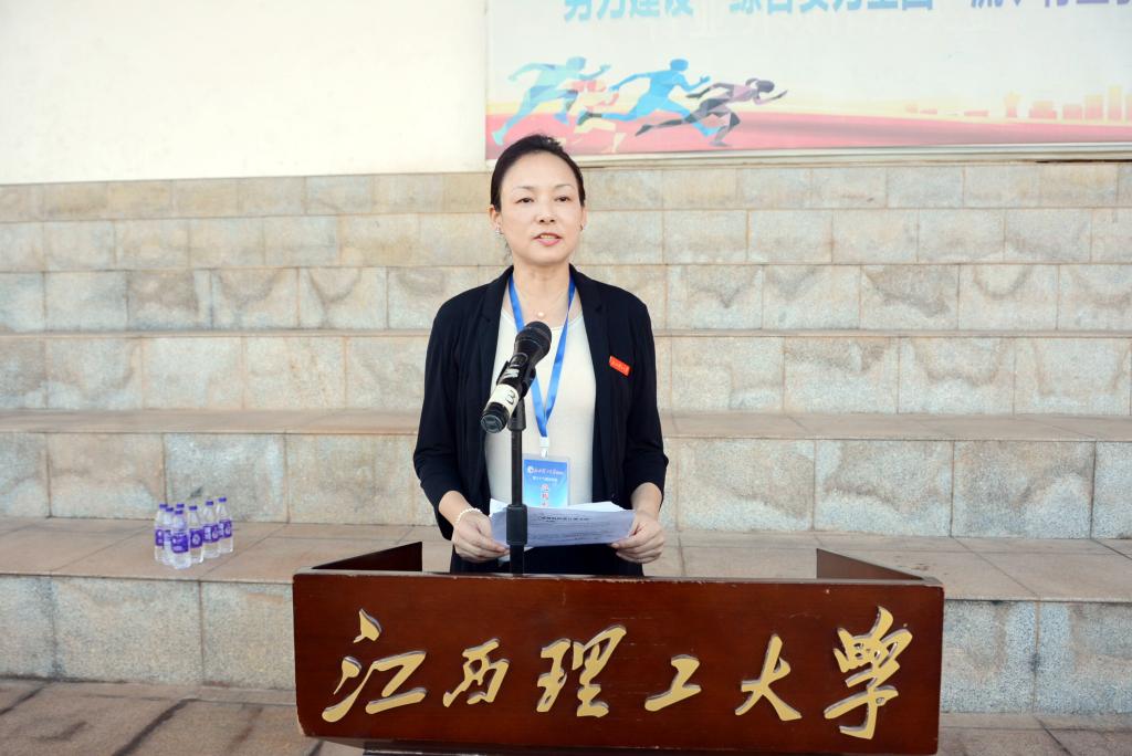 总裁判长朱凌艳宣布此次竞赛成绩、各集体项目成绩和优秀组织奖。软件工程学院荣获学院男子团体总分第一名以及50米迎面接力、搬矿石接力、集体跳绳比赛第一名,并荣获优秀组织奖;商学院荣获学院女子团体总分第一名。