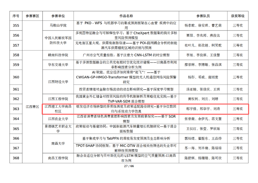 8月15日,中国统计教育学会公布江西赛区省赛获奖名单。在参赛规模有所缩减的背景下,校区省奖总数仍保持稳定,获奖率较去年进一步提升,充分体现了“以赛促教、以赛促学”机制的显著成效。