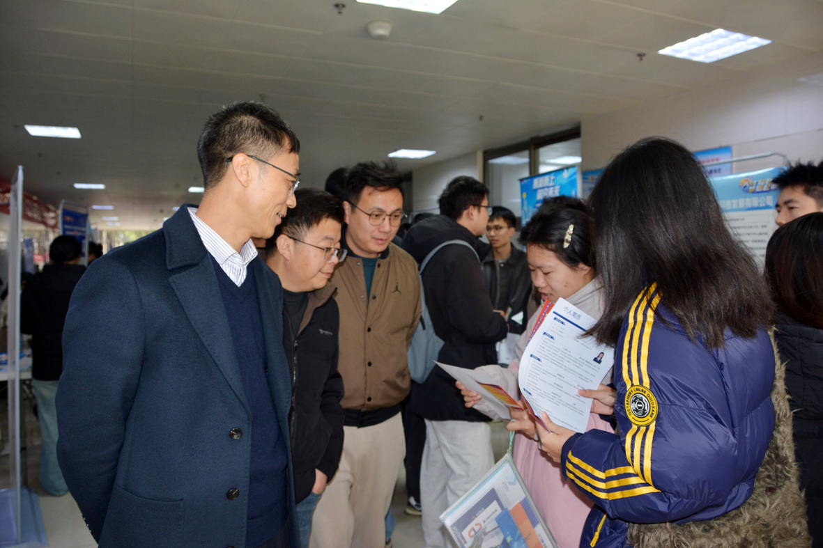 招聘会现场气氛热烈,包括百威、北京建龙矿业、兴业银行、中国人寿、嘉里粮油等世界500强的50余家企业提供了涵盖材料、机电、金融、人力资源等领域的1000余个岗位。潘春荣一行逐一走访各企业展位,仔细询问企业招聘需求、岗位要求及薪资待遇,对用人单位长期以来支持学校就业工作表示感谢。在与毕业生交流时,潘春荣鼓励同学们珍惜机会、主动沟通,将专业所学与企业需求精准对接,并叮嘱大家保持积极心态,从容应对面试。