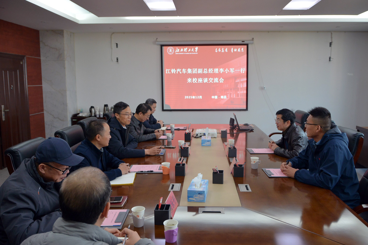 本网讯(文、图/饶振鹏)2025年12月30日下午,江铃汽车集团副总经理李小军一行来访我校。南昌校区管委会分管日常工作的副主任兼党委副书记潘春荣在南昌校区会见了李小军一行。国际创新研究院常务副院长兼能源与机械工程学院院长帅词俊、副院长李亮星等参加会议。