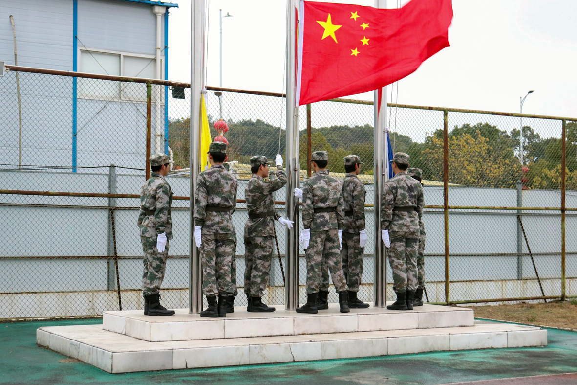 伴随着庄严的《义勇军进行曲》,五星红旗冉冉升起。在校歌《我们从这里启航》的旋律中,校名旗和校徽旗在田径场上方缓缓升起。三面旗帜在田径场上空飘扬,格外醒目。