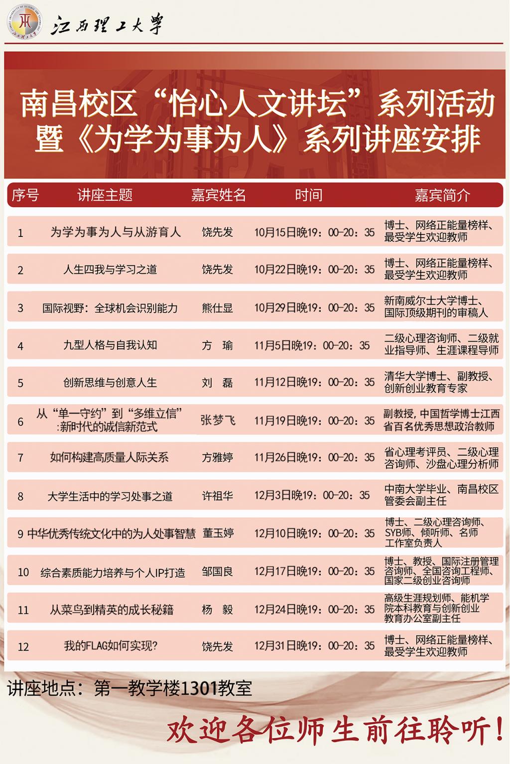 南昌校区 “怡心人文讲坛 系列活动 暨《为学为事为人》 系列讲座安排